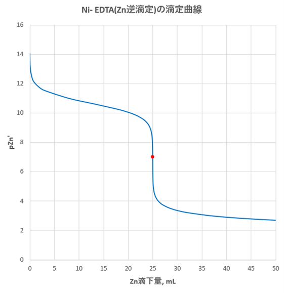 pH5.5におけるZn逆滴定の滴定曲線(Zn滴下量-pZn’)を図-2に示します。