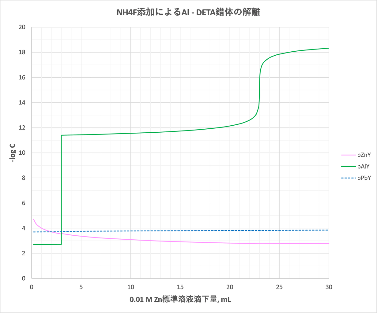 Zn逆滴定におけるZn滴下量とpZn’, pAl’, pPb’, pY’の関係を図-2に示します。また、Zn滴下量とp[ZnY], p[AlY], p[Pb]の関係を図-3に示します。
