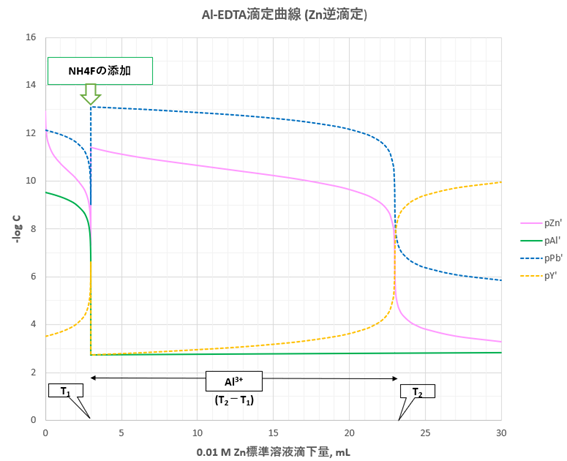 これをCzo mol/Lの標準Zn溶液で引き続き滴定し、第2終点のZn滴下量をT2 mLとすると、(T2-T1)は、AlYから遊離したEDTAの物質量に対応し、これはAlと当量なので、試料中のAlの物質量は、