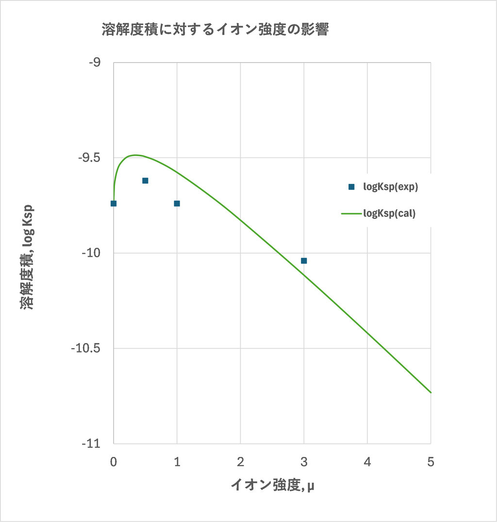 β1, β2, Ksp, Kwに関して、kはそれぞれ0.23, 0.22, 0.34, 0.28となり、デービス式(k=0.2あるいは0.3)をほぼ満足する値となりました。溶解度の計算にはこれらの値を使用しました。