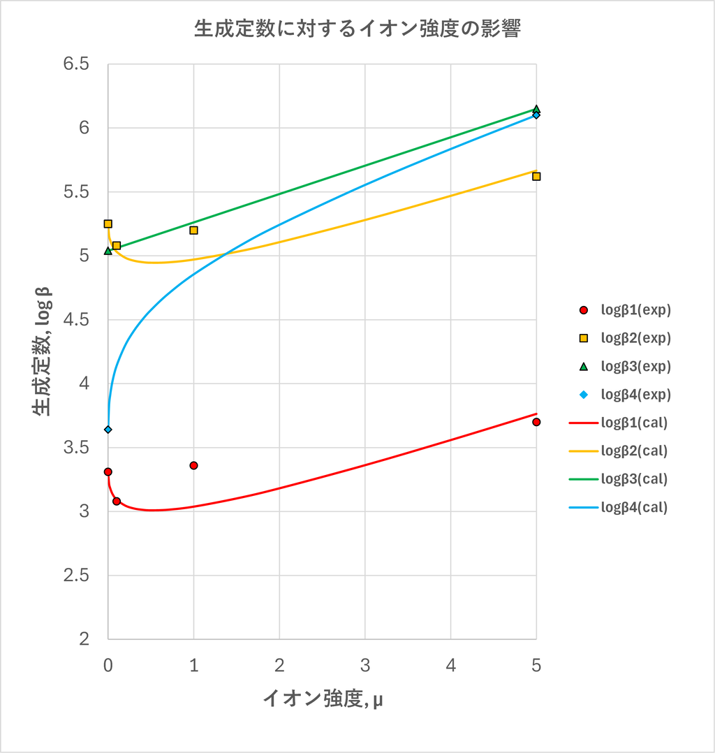 また、β3は本質的にはイオン強度とは無関係になるはずですが、実際はμ=0とμ=5の値が異なるので、次式で補正しました。