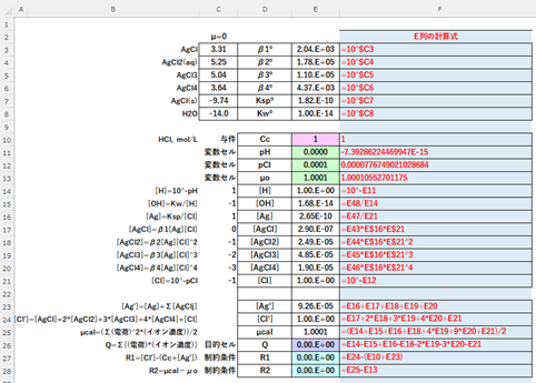 与件として塩酸濃度(Cc)を与え、次のパラメータ設定を行い、pH, pCl μoに適切な初期値を与えてソルバーを実行し、AgClの溶解度[Ag’](=S)を求めます(*3)。