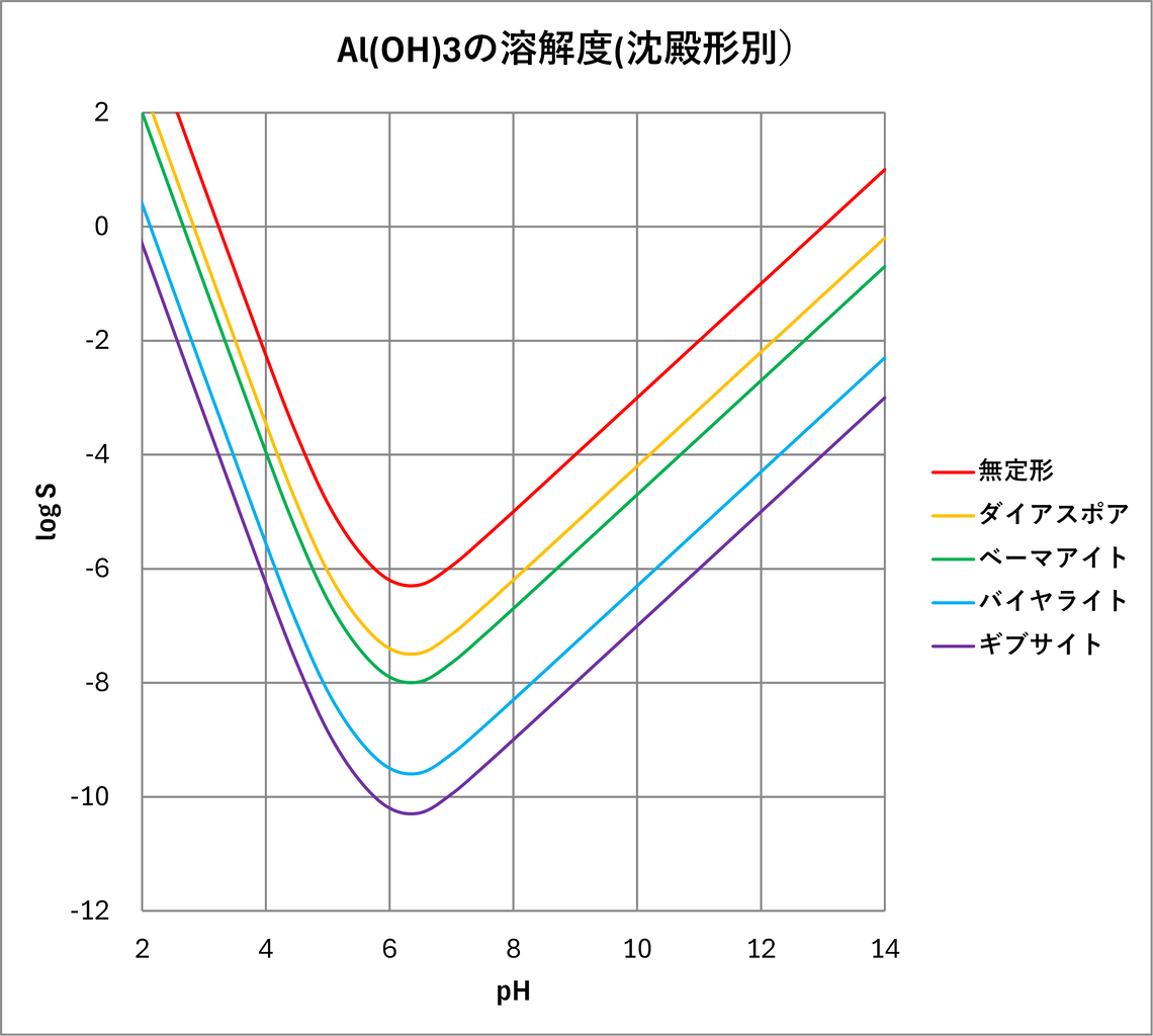 前項では、沈殿形態として無定形を想定しましたが、水酸化アルミニウムの沈殿は生成条件の違いによっていくつかの結晶形があり、それぞれ溶解度積(Ksp)が異なります。結晶形の違いによる溶解度の変化の様子を調べます。
