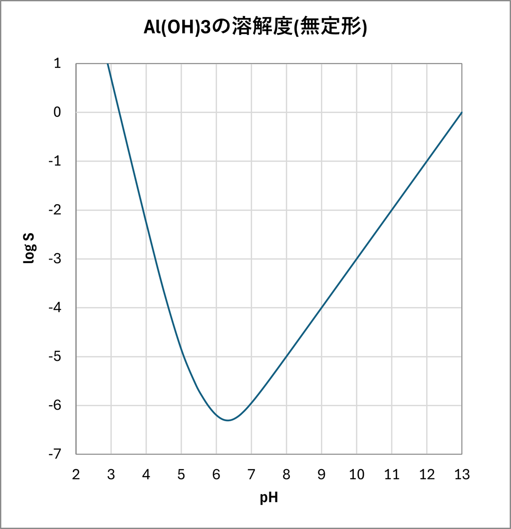 (*1) Al(OH)3の溶解度積の値は、沈殿の生成条件によって大きく異なる(pKsp=32.3(無定形)~36.3(ギブサイト))。ここでは無定形(アモルファス)の生成を想定した。また実際には安定した多核錯体も生成する。多核錯体の解重合反応は遅く、平衡状態になるまで時間がかかる。さらに、イオン強度の影響や共存アニオンの影響の影響もある。したがって実際の平衡はもっと複雑なものとなる。