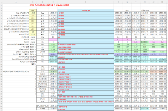 0.1 mol/L Fe(NO3)3水溶液に酸(HNO3)または塩基(NaOH)を加えたときの化学種濃度を、エクセルのソルバー機能を用いて求めます。酸または塩基の添加によって体積は変化しないものとします。