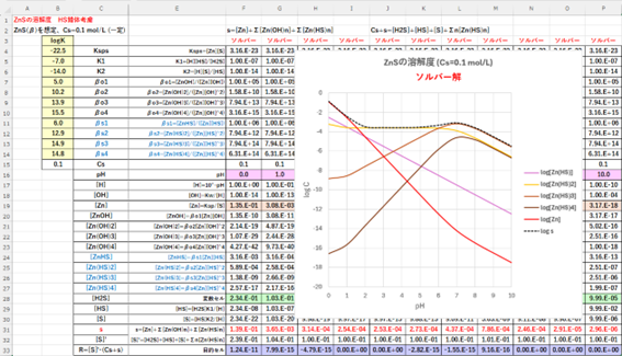 pHが決まれば、[OH]も[HS]も一義的に決まるので①式でsを求めることができます。エクセルシートによる計算例、およびpHと溶解度・化学種濃度の関係を図-1に示します。
