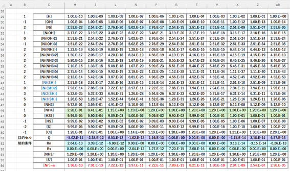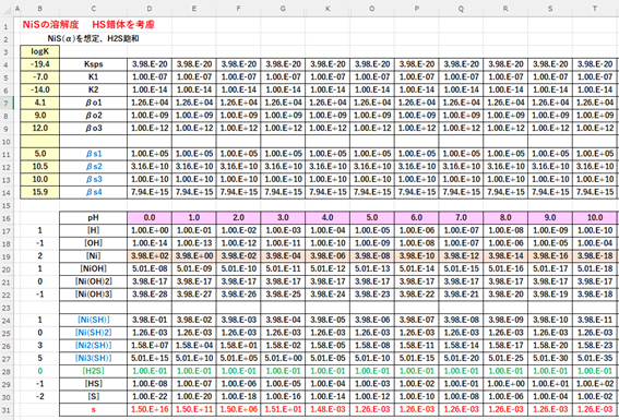mol/L)を加えて加熱した溶液に対するNiS(γ)の溶解度を求めます。硫化物錯体の生成を考慮します。活量係数は考慮しません。