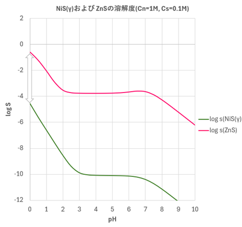 NiS(γ)は全pH領域において溶解度は非常に小さく、一度生成した沈殿は強酸性でも溶解しません。一方ZnSは強酸性(pH=0)で沈殿が溶解することが分ります。