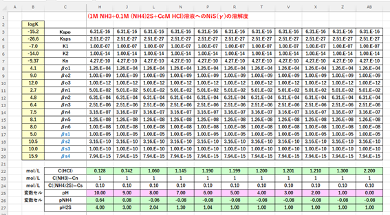ここでは、一定濃度の硫化アンモニウム(Cs=0.1 mol/L)およびアンモニア(Cn=1 mol/L)を含む溶液に強酸(HCl:Cc