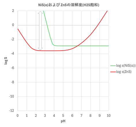 図-6から明らかなように、酸性(pH=2.5)においてZnSは沈殿しますが、NiS(α)は沈殿ないことが分ります。