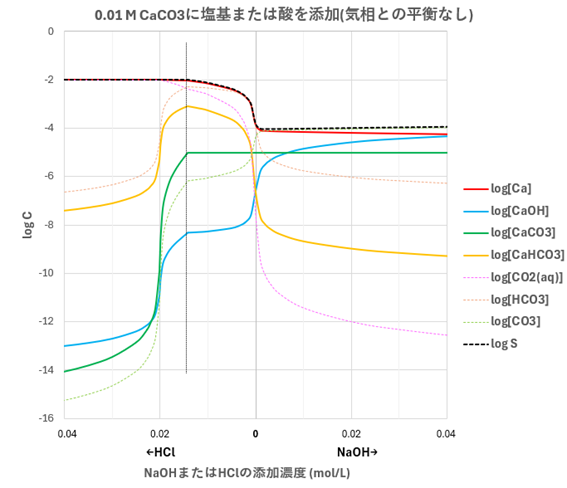CaCO3 0.01 molに水を加えて1 Lにした懸濁液に強酸(HCl)または強塩基(NaOH)を加えたときのCaCO3の溶解度と各化学種濃度を求めよ。酸・塩基の添加や沈殿物の減少・消滅による溶液の体積変化はないものとする。活量係数は1とする。また気相中CO2との平衡はないものとする。
