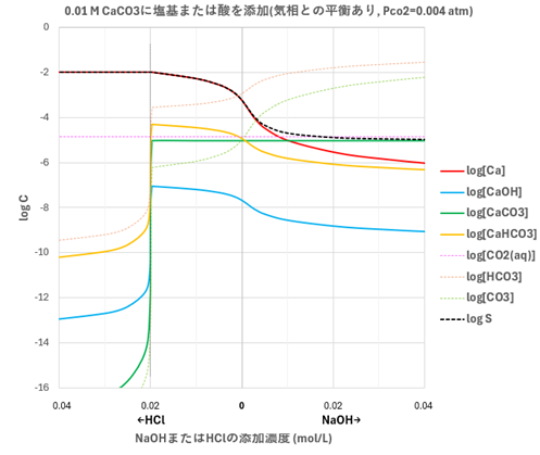 <固体CaCO3が共存する溶液にNaOHまたはHClを加える>
