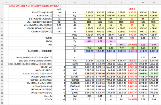 ソルバーを用いて、pHおよびPCO2を与えてCaCO3の溶解度を求めました。ソルバーの条件設定は次の通り。CAが負の値を示すときは強塩基が加えられたと考えます。