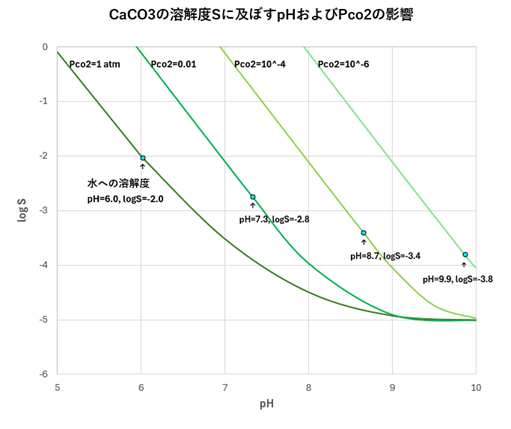 <CaCO3の溶解度に及ぼすpH, 分圧PCO2の影響>