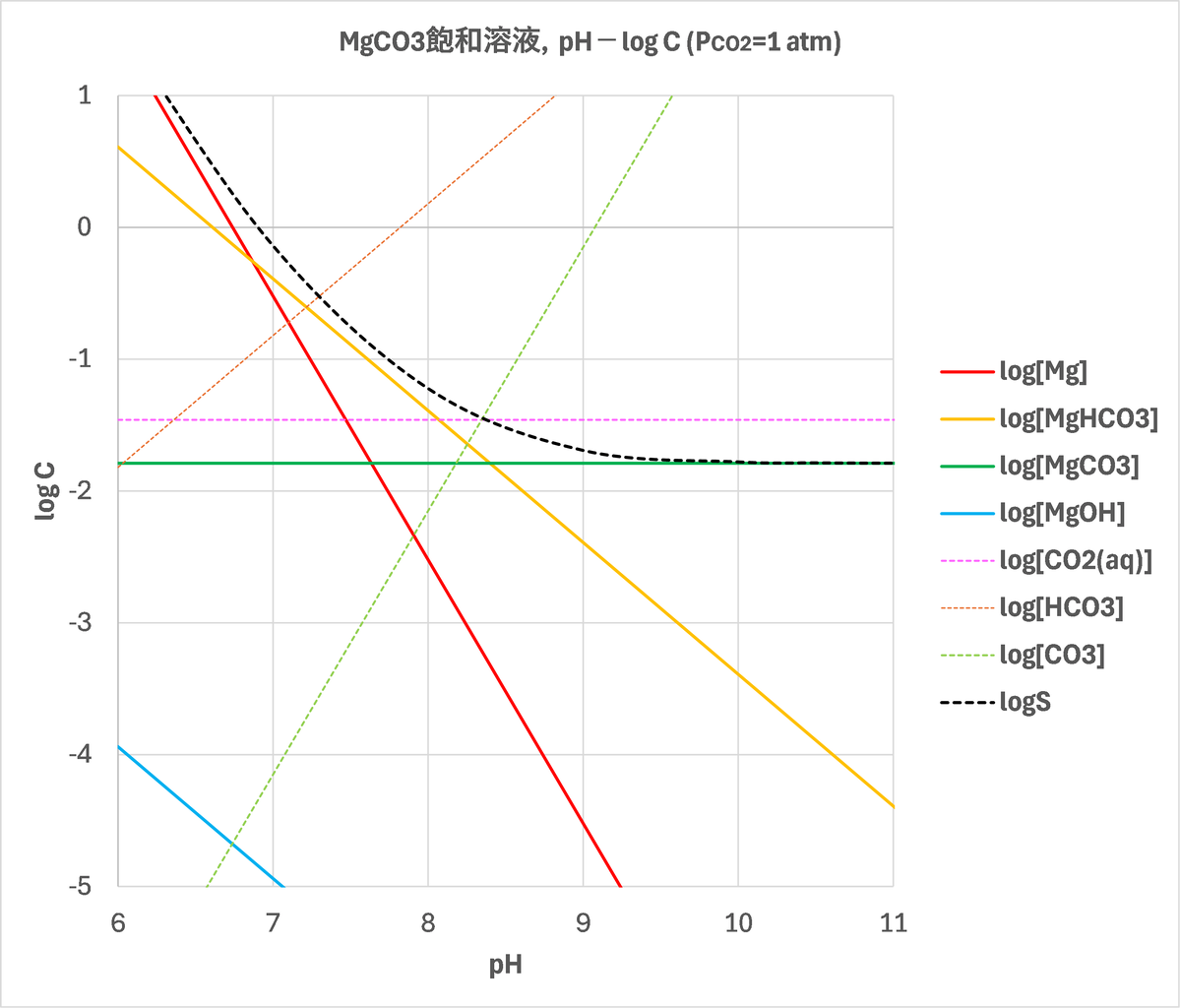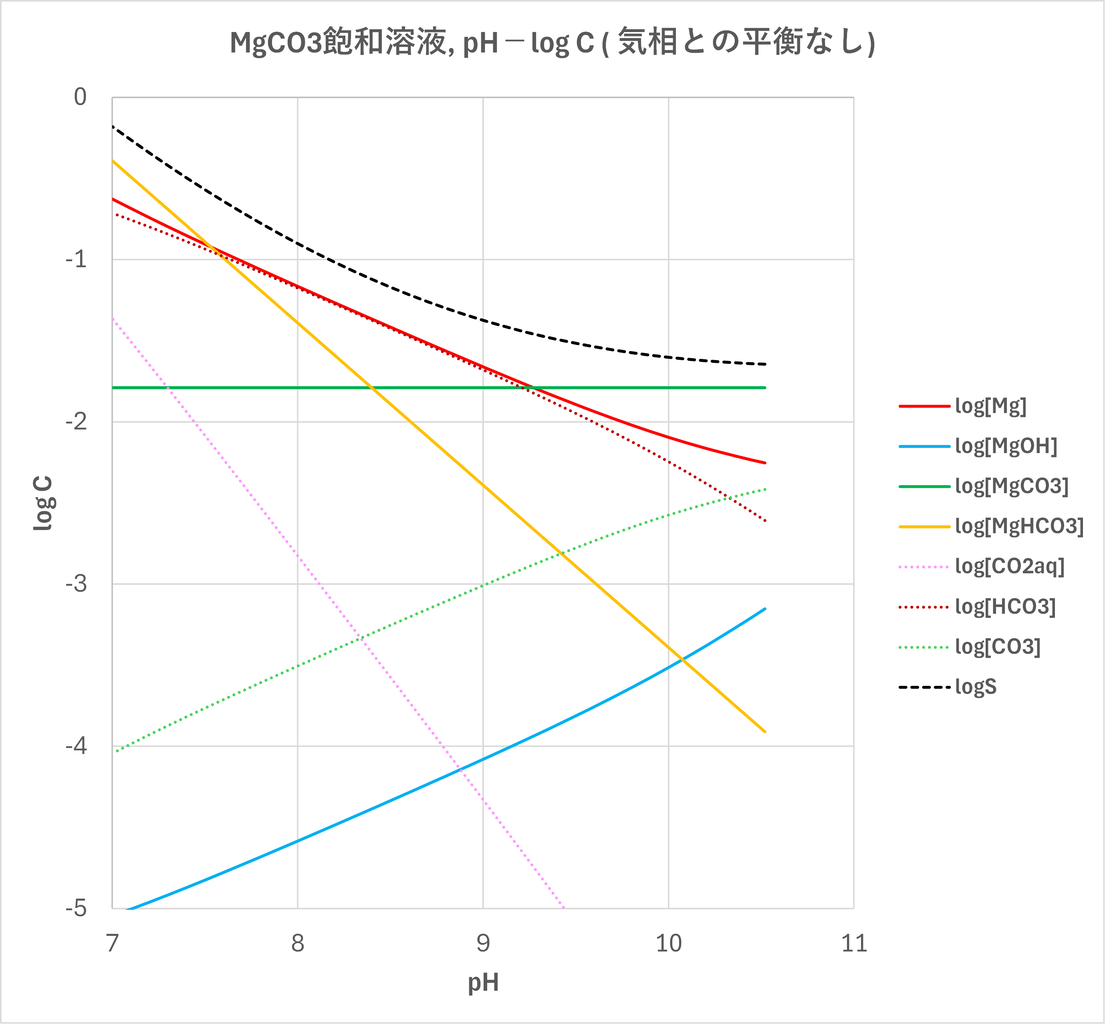 Mgに関する化学種は、pHが7.5より低いとMgHCO3+が優勢であり、pHが7.5~9.3ではMg2+が優勢、9.3を超えるとMgCO3が優勢となります。
