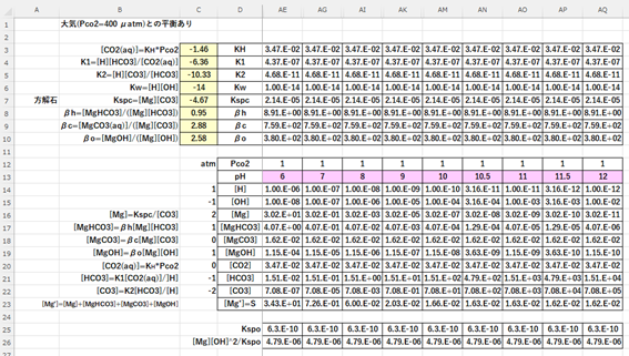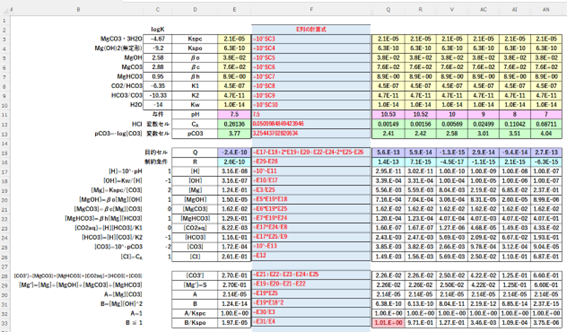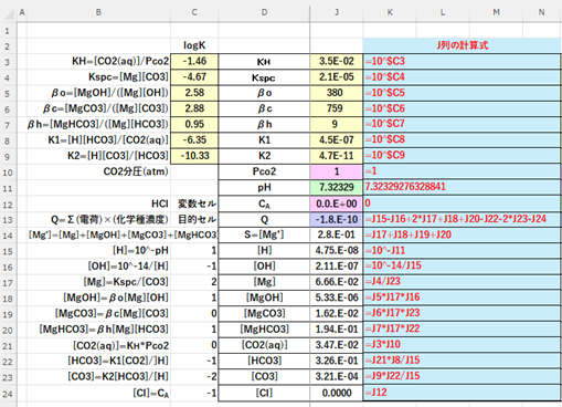 ソルバーの計算では、溶液のpH(=-log[H])を与件とし、HClの必要濃度CA mol/LおよびpCO3(=-log[CO3])を変数とします。もし計算の結果CAが負の値となったときは-CAを1価の強塩基の濃度と考えます。