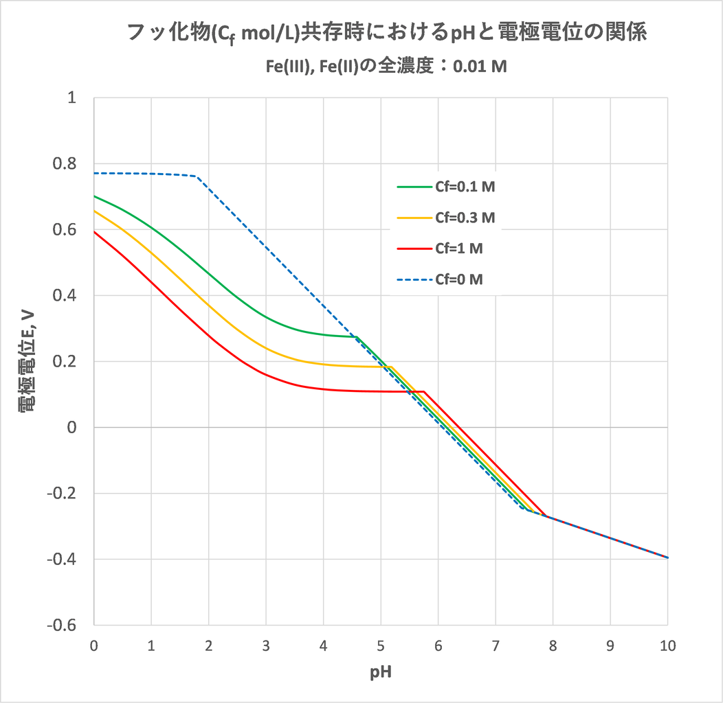 Fe(III), Fe(II)の全濃度(CIII,CII)をCIII=CII=0.01 mol/Lとし、フッ化物の全濃度(Cf)をCf=1, 0.3, 0.1