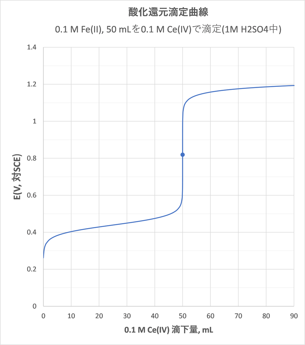 酸化還元滴定でよく用いられる「セリウム(IV)標準溶液によるによる鉄(II)の滴定」を例として、当量点以前・当量点・当量点以降で場合分けをして近似式を作成し、酸化還元滴定曲線を描く方法を説明します。