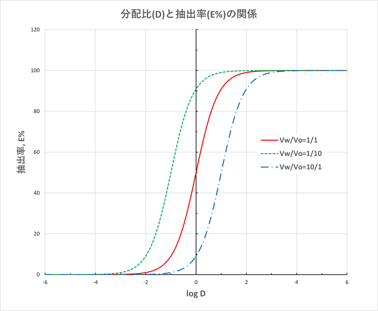E(%)は有機相への抽出の程度を示す実用的に便利な指標であり、Dの値が大きいほど、また水相の体積(Vw)に対して有機相の体積(Vo)が大きいほど抽出率は向上することが分かります。