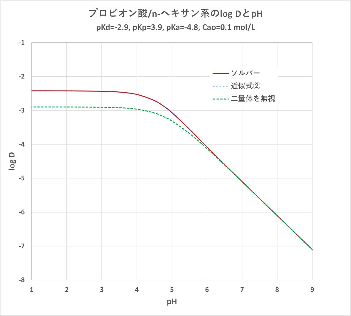 具体的に、プロピオン酸のn-ヘキサンによる溶媒抽出について、Ka=10^-4.8,