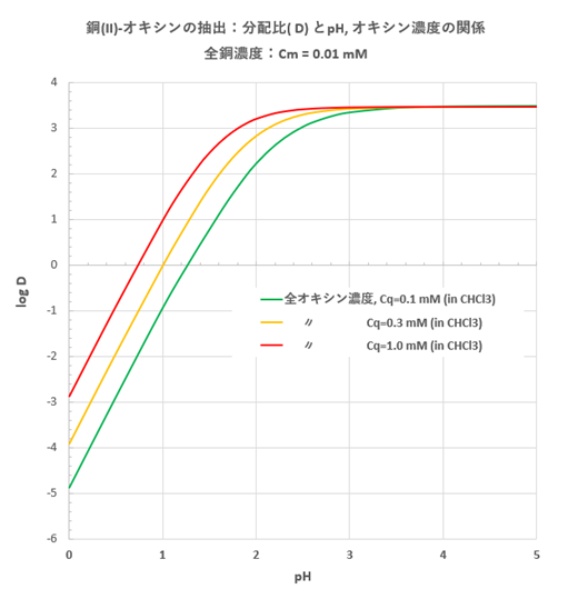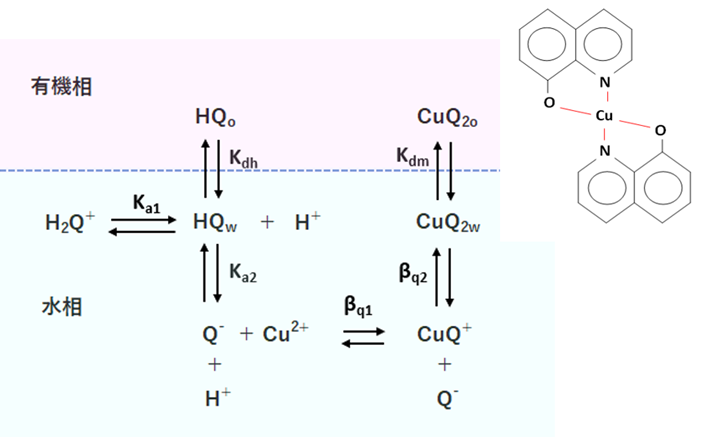 水相中で、Cu2+の低次のオキシン錯体と水酸化物錯体の生成を考慮すると、