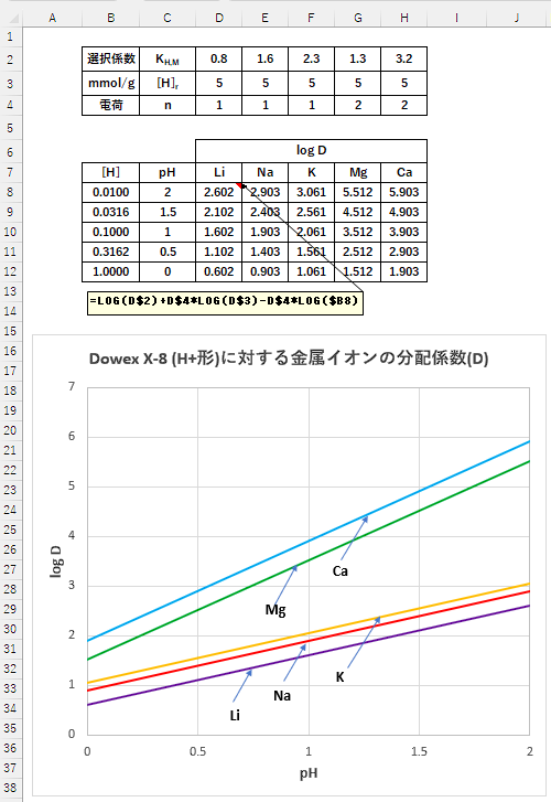 aqn[M]r/([H] rn[M]aq))の値が下表のように与えられたとき、logDとlog[H]の関係を求めます。ただし樹脂のイオン交換容量を5 meq/gとし、Mn+は微量で[H]rの値はイオン交換後も交換容量と同じとします([H]r = 5 mmol/g)。またイオン強度の影響は無視します。