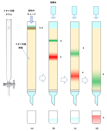 前回(2025-10-19)はバッチ法を用いてイオン交換分離を行う方法について述べました。今回は、カラム法によるイオン交換分離について述べます。カラム法では、カラムに詰めたイオン交換樹脂の上部に金属イオンを含む試料を注入して吸着させ、さらに溶離液を流すことにより吸着帯を下降させます。このとき、個々の金属イオンのイオン交換樹脂に対する吸着能力(分配係数)の違いにより金属イオン吸着帯の下降の程度が異なり、金属イオンを互いに分離することができます。