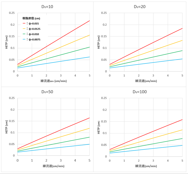 ②式から分かるように、流速が遅いほど、粒径が小さいほど、また分配係数が大きいほど、理論段高さ(HETP)は小さくなります。