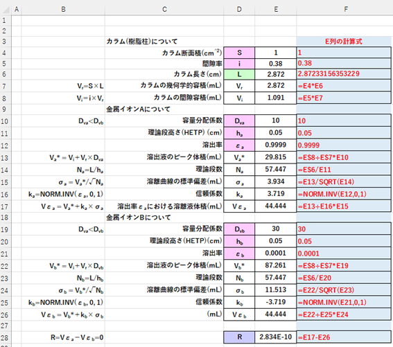 前提条件として、カラム断面積(S (cm2))、間隙率(i)、金属イオンA, Bそれぞれに関する容量分配係数(Dva, Dvb)、理論段高さ(HETP)