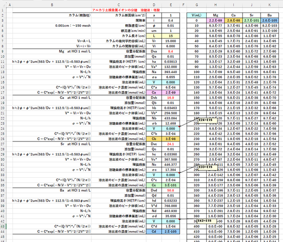 Dv,Ba=50.8)、各イオンの添加量(各々0.01 mmol)」として、溶出液体積と濃度の関係をエクセルで計算しました(2025-11-16を参照)。得られたエクセルシート(一部)を図-1に示し、溶離曲線を図-2に示します。