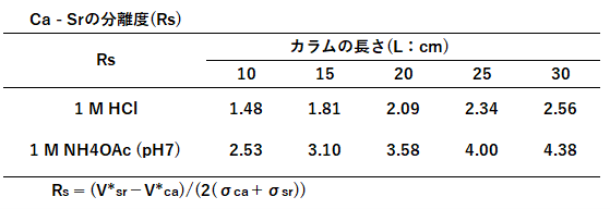 図-2と図-3を比較してみると、たとえば、CaとSrの分離では溶離液として塩酸を用いるよりも酢酸アンモニウムの方が優れていることが分かります。カラムの長さを変えて分離度(Rs)(2025-11-02)を比較すると、図-4のようになります。カラム長10 cmで酢酸アンモニウムを用いたときと同じ分離度を塩酸で達成するためにはおよそ30