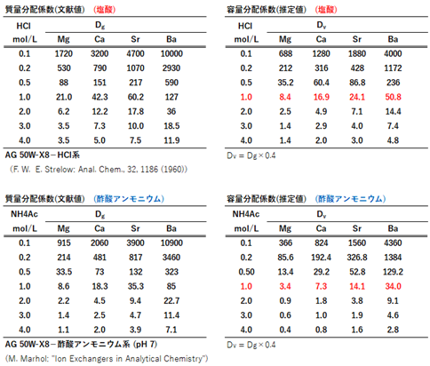 陽イオン交換樹脂AG 50W-X8-HCl系およびAG 50W-X8-酢酸アンモニウム系におけるアルカリ土類金属イオンの質量分配係数(Dg)の文献値および容量分配係数(Dv)の推定値を下表に示します(樹脂層の密度:ρ=0.4 gresin/mLresinとする)。