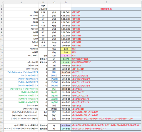 ソルバーによる計算例を図-3に示します。用いた平衡定数値は図中に示します。