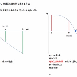 「二分法」は、解を含む区間の中間点を求める操作を繰り返すことによって方程式を解く方法です。エクセルで「二分法」を用いると、弱酸-強塩基滴定などの複雑な滴定曲を迅速かつ簡便に作成することができます。 <二分法の概要>関数Q(x)を考えます。具体的には、たとえば酢 ...