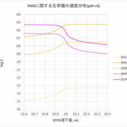 ニッケルとEDTAの錯生成定数は大きいのですが、生成速度が遅いので、直接に滴定する場合は溶液を加温してゆっくり滴定する等の工夫が必要です。今回は、Cu-PANを指示薬に用いて、Ni2+をEDTAで直接に滴定する場合について考えます。 <<Cu-PANとは>> PAN(1-ピリジルアゾ ...