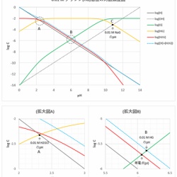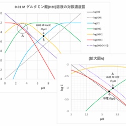 代表的なアミノ酸(α-アミノ酸)について、その化学種の濃度がpHによってどのように変化するか調べます。 水溶液中のアミノ酸は、pHが低いときはアミノ基とカルボキシ基の両方(および側鎖の基)がすべてプロトン化され陽イオンの形をとります。pHが上がるにつれてプロトンが外 ...