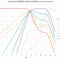 前々回(2024-04-07)は非常に単純な系(すなわち金属イオンが配位子と反応するのみで他の副反応は起きない場合)について考えました。しかし、前回(2024-04-14)でも述べたように、実際の錯生成反応においては、多くの副反応が起きて、対象とする錯生成反応に影響を与えます。今 ...