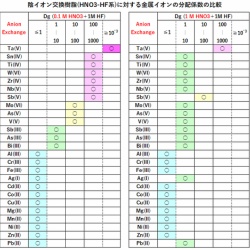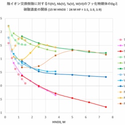 Ti, Zr, Nb,Ta, Wなどの金属や合金を溶解するためによく用いられる溶解剤は硝酸+フッ化水素酸です。したがってこれらの金属・合金の分析でイオン交換分離を行う場合、そのまま硝酸+フッ化水素酸系で溶離するのが簡便です。今回は、硝酸+フッ化水素酸系でのイオン交換を取りあ ...