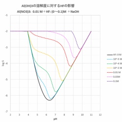 水酸化物イオンとは別に錯形成剤を添加すると、水酸化アルミニウムの溶解度は変化します。今回はフッ化物イオンの影響について調べます。 Cal=0.01 mol/LのAl(NO3)3、Cfmol/LのHFおよびCn mol/LのNaOHを含む溶液について考えます。Cf, Cnを変化させたときのpHに対するAl(OH) ...
