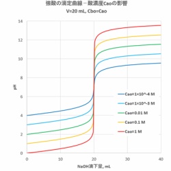 これまでモノプロトン酸・塩基の滴定曲線の描き方について説明してきました。今回はこのようにして作成した滴定曲線について、その特徴と濃度、酸解離定数の影響について調べます。 <<滴定曲線の特徴>> 典型的な例として、0.1 mol/Lの硝酸(HNO3) 20 mLあるいは0.1 mol ...