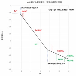 前々回(2022/03/27)、前回(2022/04/03)述べたように、電極電位は酸塩基反応・錯生成反応・沈殿反応といった副反応の影響を受けます。今回は、Fe(III)-Fe(II)系の酸化還元反応に対するpHの影響について調べます。 Fe3+イオン、Fe2+イオンはpHを上げるとさまざまな水酸 ...