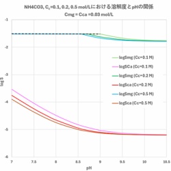 前回(2025-02-16)の検討で明らかなように、炭酸塩によるCaとMgの分別沈殿において、pHおよび(NH4)2CO3の添加濃度が高くなると、場合によってはMgCO3の沈殿が生じます。また逆にこれらを低くなると、CaCO3の溶解度が大きくなり、沈殿が不完全になります。どのような条件下でMg ...