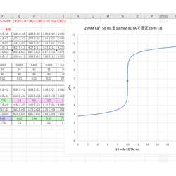 前回(2020/05/10)は、ソルバーを用いてカルシウムのEDTA滴定における滴定曲線を描きました。今回はソルバーを用いず、Ca2+の加水分解(CaOH+の生成)を考慮した関係式を求めて滴定曲線を描きます。 平衡定数は前回の通りです(μ=0.1)。・EDTA(H4Y)の酸解離定数:K1= [H][H3Y]/ ...
