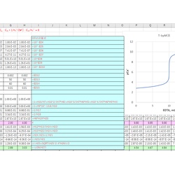 EDTAによるカルシウムの滴定曲線を求めます。まず、①「EDTA滴定の基礎」(2020/05/03)において導いた式を用いて、pH13における滴定曲線を描きます。ついで、②CaOH+, CaHY-の錯生成およびCa(OH)2の沈殿生成を考慮に入れ、ソルバーを用いてもう少し厳密な計算をして滴定曲線を ...