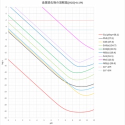 pHの異なる溶液に対する様々な金属硫化物の溶解度を求め、pHと溶解度の関係を調べます。また、硫化物の分別沈殿法の系統的定性分析への応用について考えます。 <<様々な金属硫化物の溶解度とpHの関係>> pHを調整した硫化水素飽和水へのCuS, PbS, CdS, ZnS, NiS, FeSお ...