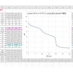前回(2020/03/08)は「レビ法」による酸の滴定曲線の作り方を示しましたが、今回は塩基を強酸で滴定する方法です。考え方は前回と全く同じです。 ●1価の弱塩基(アンモニア)Cbo mol/L, V mLの1価の弱塩基(たとえばアンモニア)をCao mol/LのHClで滴定する場合(滴下量:T mL) ...