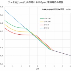 前回(2022-04-10)は、Fe(Ⅲ)-Fe(Ⅱ)系に対するpHの影響について調べました。ここにさらに錯生成剤が加わるとどうなるでしょうか? 今回は、フッ化物イオン(F-)が加わると電極電位がどのように変化するかを調べます。 <<関係式、定数値>> フッ化物イオン(F-)が共存する場合 ...